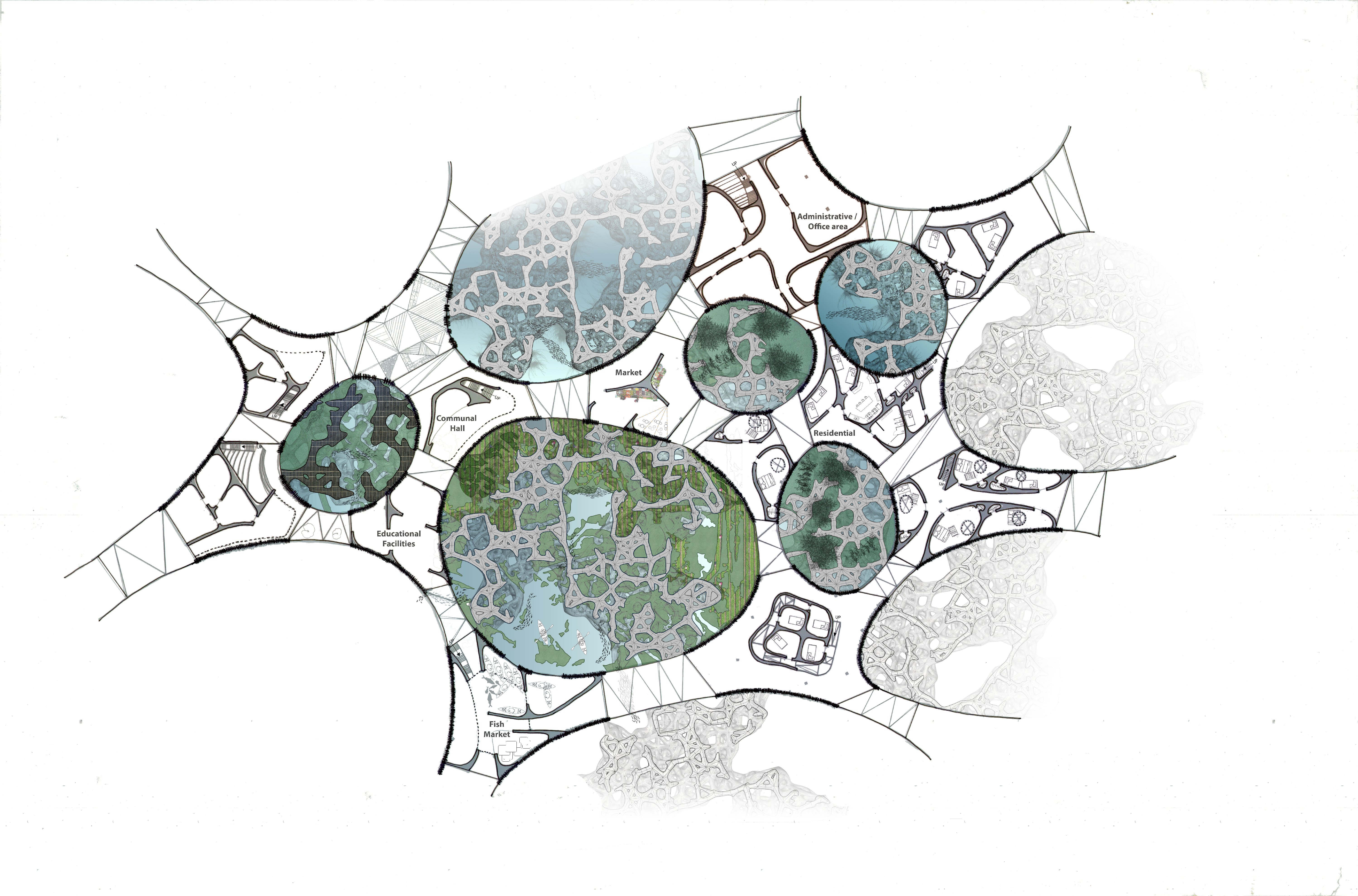 By using Recycled oil drums for buyoncy, a bamboo mesh network is generated on a framework of Gabion cages. This Mesh acts as a lattice framework to regenerate the marsh, and restore the natural filtration system of the coast.